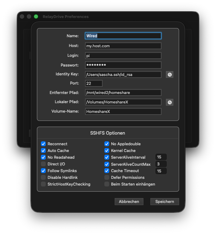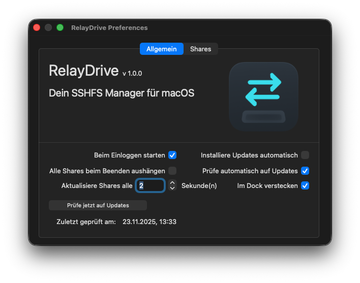 RelayDrive ist eine leistungsfähige macOS-Anwendung, die das Mounten und Verwalten von SSHFS-Freigaben deutlich vereinfacht. Mit einer intuitiven Benutzeroberfläche und flexiblen Einstellungen bietet RelayDrive eine ideale Lösung für Entwickler, Systemadministratoren und Power-User, die Netzlaufwerke sicher und performant in ihr Dateisystem integrieren möchten. RelayDrive läuft hauptsächlich in der Menüleiste.